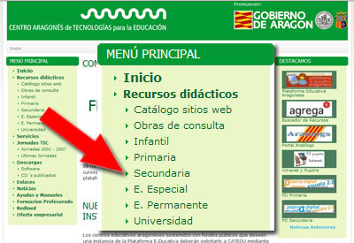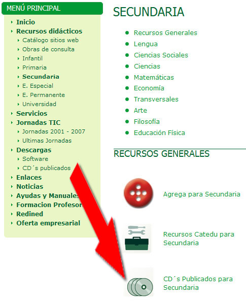 El menú principal ofrece el acceso a los recursos didácticos de Secundaria, clasificados en recursos generales o distribuidos por áreas. En este último caso suele tratarse de portales temáticos.