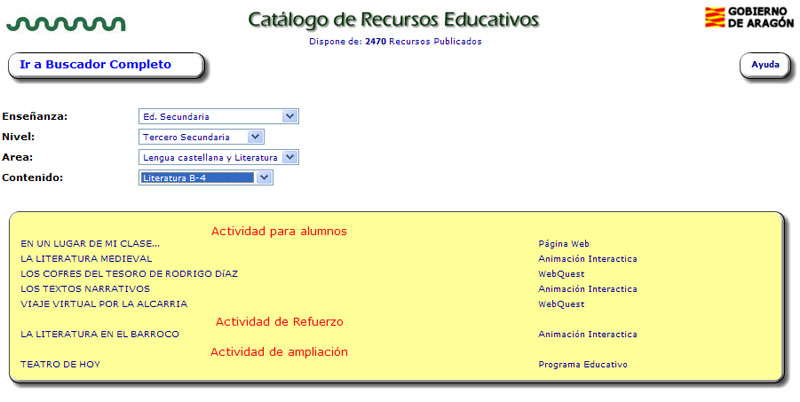 Basta con seleccionar el tipo de enseñanza (secundaria, por ejemplo), el nivel, el área y el contenido, tras completar la selección aparecerá la lista de recursos.Búsqueda avanzada