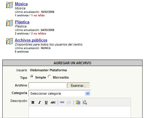 El nombre del grupo, las últimas noticias publicadas, la identificación del usuario y, sobre todo, lo que tiene pendiente de leer son las entradas más relevantes. Este es el aspecto que tiene el contenido de la página de archivos, muy similar al de enlaces. Si el usuario tiene permisos para ello, podrá subirlos, en caso contrario, sólo podrá descargarlos.