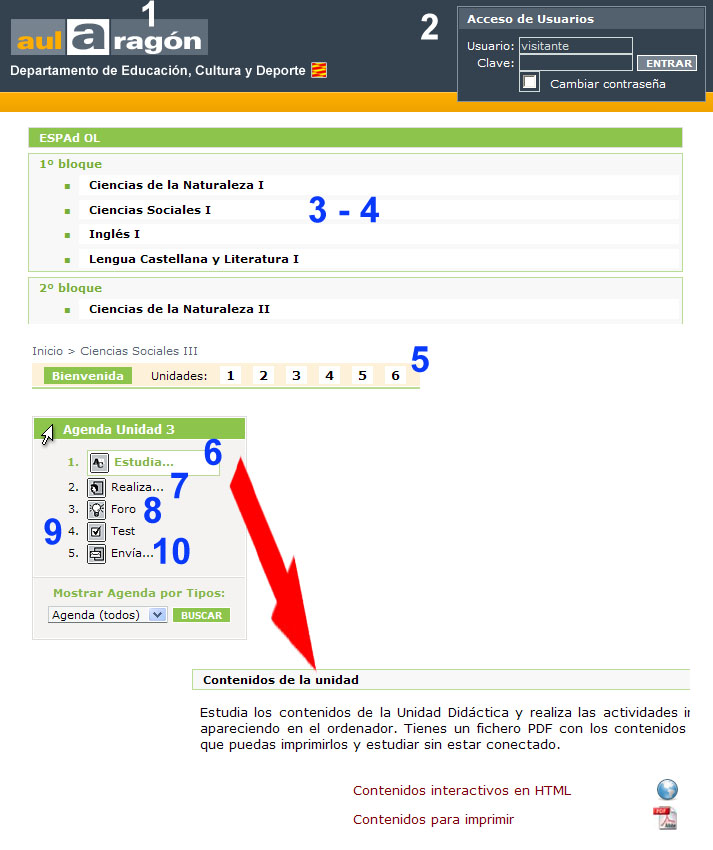 - El apartado estudia de la agenda contiene los materiales en dos versiones, navegable y descargable, aunque recomendamos la primera pues dispone de una interactividad, complementos y actividades de los que carece la segunda.